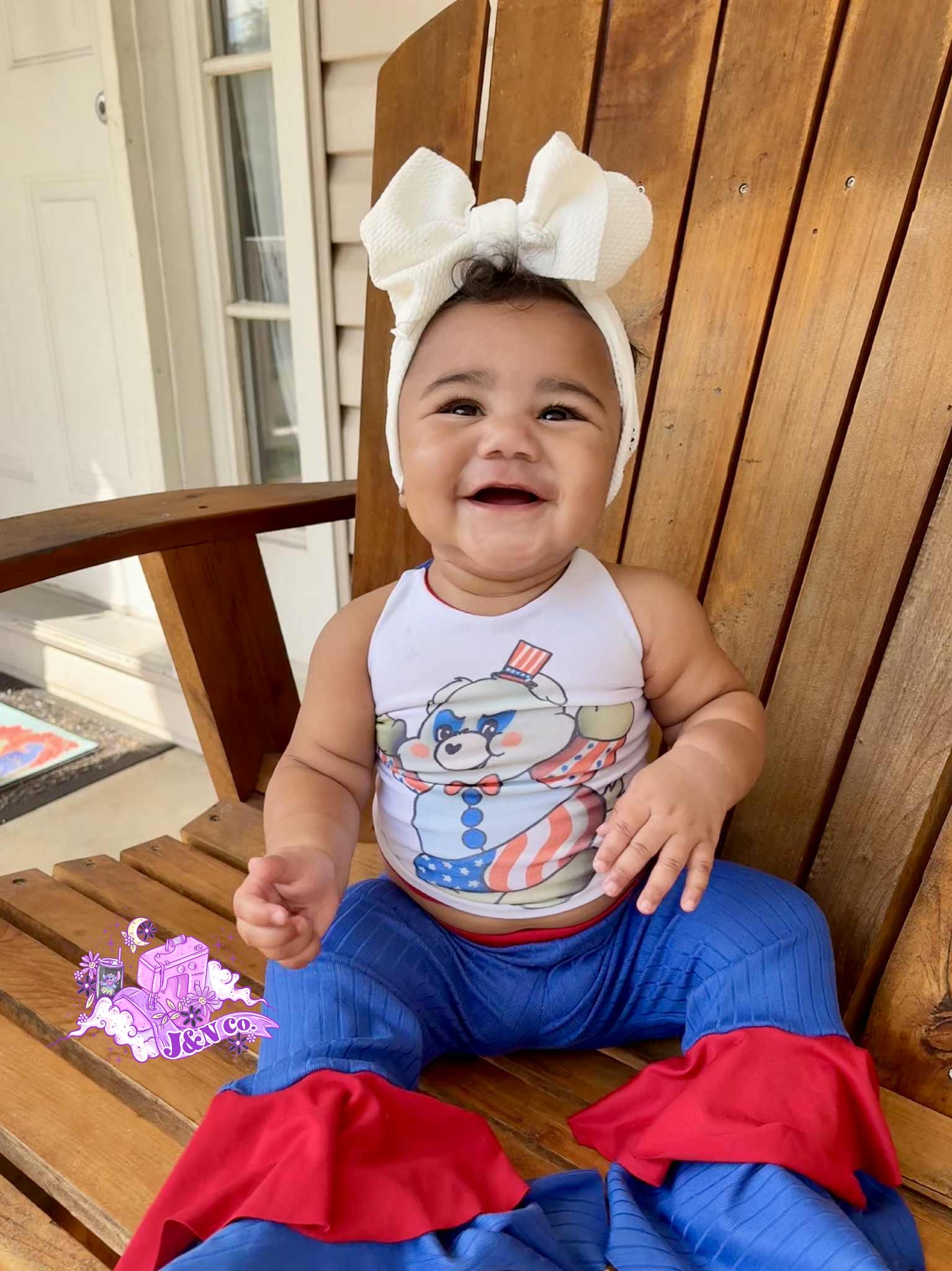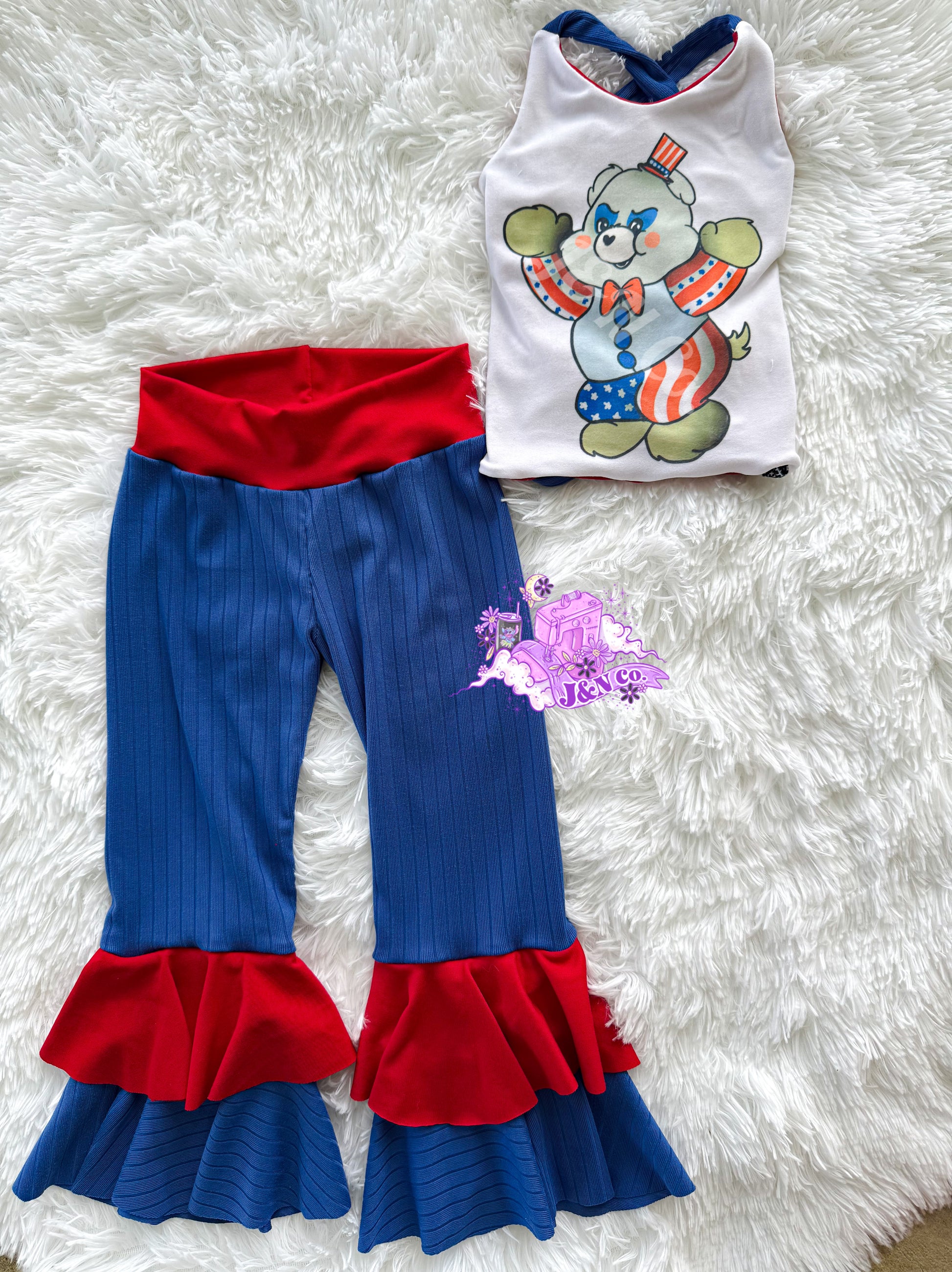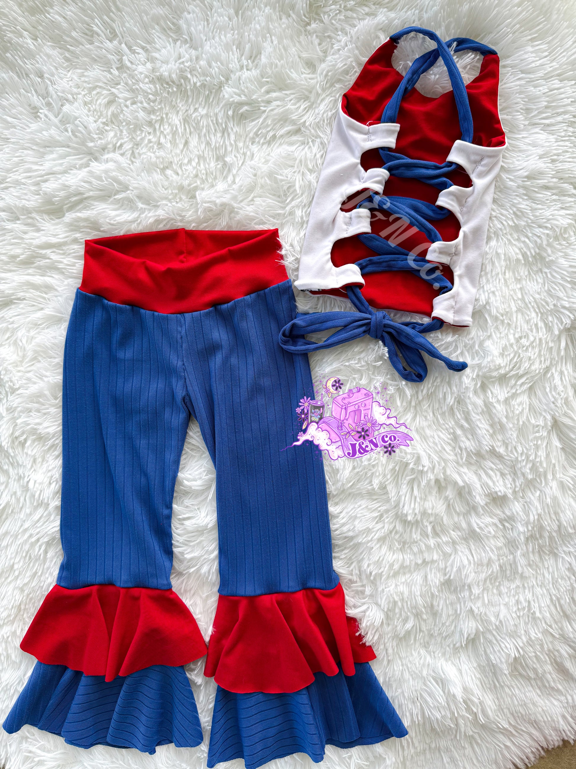 Style Shown: Cross back halter & boujee bell bottoms with red DBP and blue rib